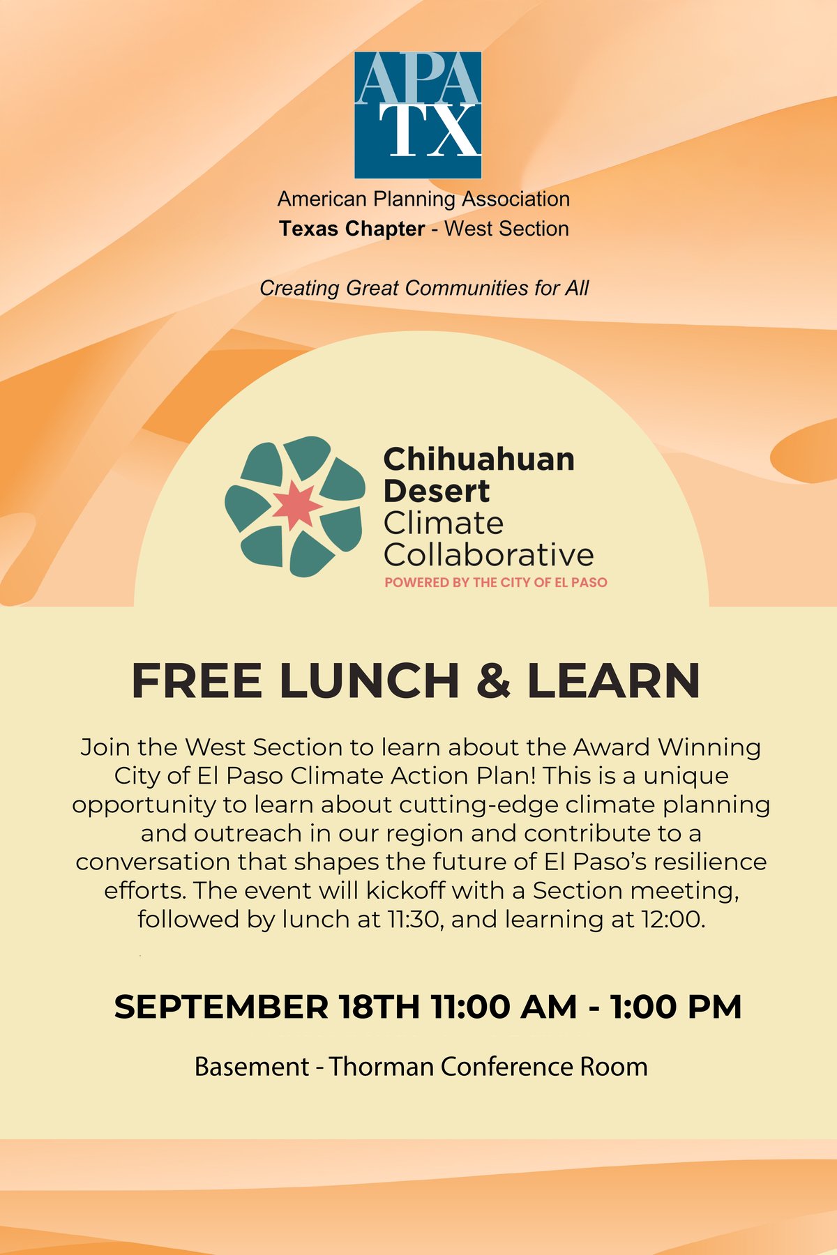 The West Section held a lunch and learn event on September 18, 2025 to invite its membership to start with a board meeting followed by lunch and a presentation from the City of El Paso regarding the undergoing Climate Action Plan for the region. CM credits were available for those who participated.